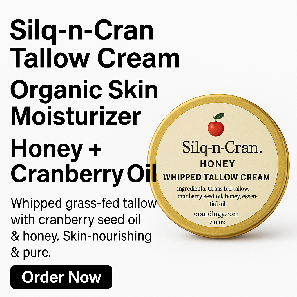 Experience the power of nature with our Silq-n-Cran™ Honey Whipped Tallow Cream—a luxurious blend of grass-fed beef tallow, cranberry seed oil, and organic honey. Packed with vitamins A, D, E & K, this nutrient-rich moisturizer deeply hydrates, soothes, and restores your skin’s natural balance.