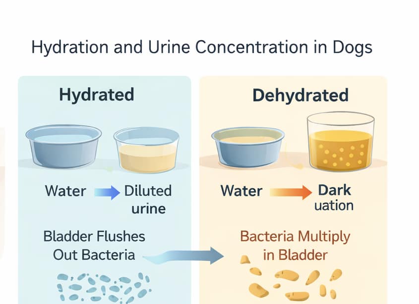 Hydration helps dilute urine, which reduces bladder irritation, lowers the risk of crystal formation, and helps flush bacteria out of the urinary tract. Dogs that are mildly dehydrated often produce concentrated urine, increasing the likelihood of urinary discomfort and infection.